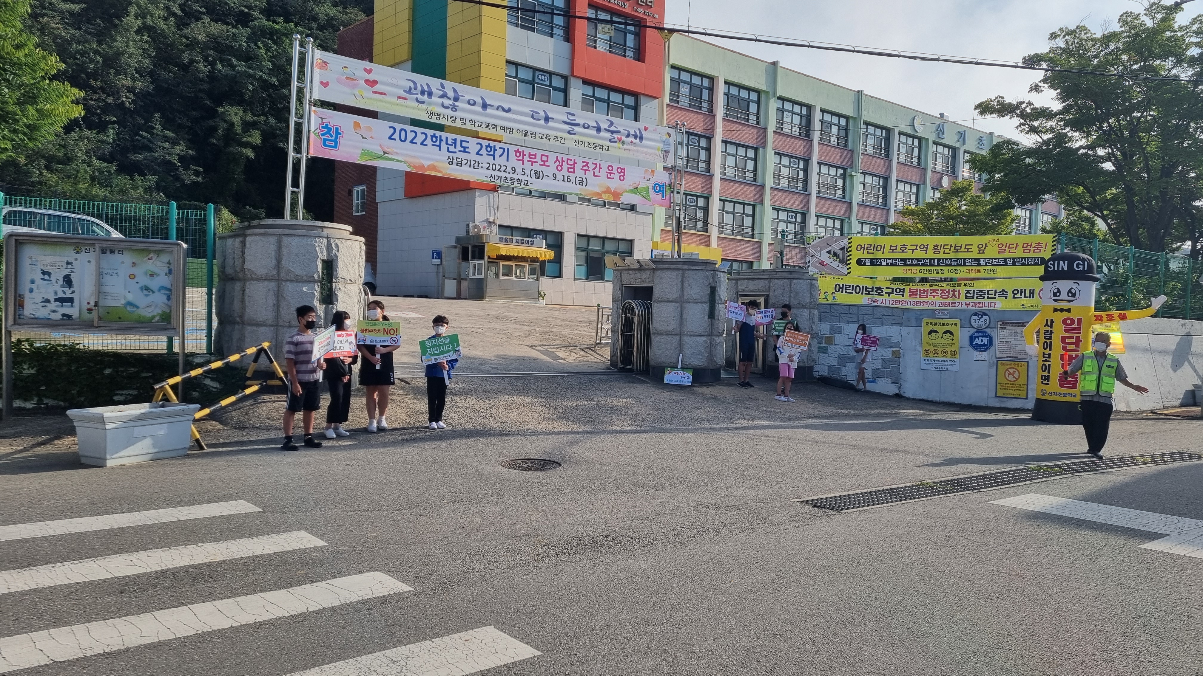 ♣ 따라서 신기초등학교 학생회는 2학기 첫 활동으로 등굣길 캠페인을 통하여 교통안전 의식을 높이는 계기를 마련하기로 하였다. 학생회 임원들은 학교 근처에서 주정차하는 운전자를 향해 피켓과 문구를 들어 보이고, 인근 다른 학교 학생들에게도 보행 안전 수칙을 홍보하는 등 적극적으로 활동하였다.