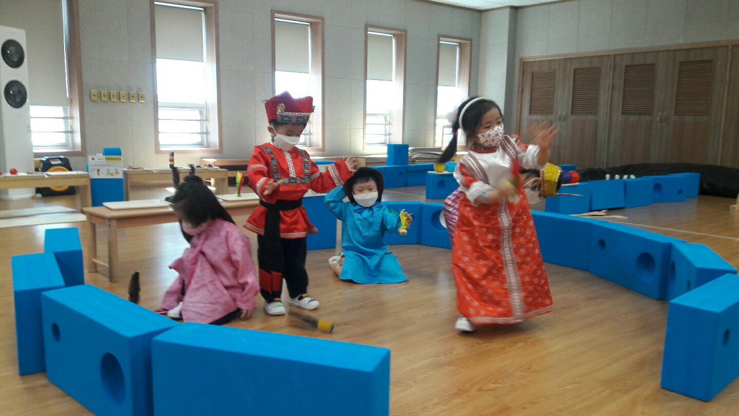□ 먼저 사전활동으로 여러나라의 문화와 다양한 놀이에 대해 이야기 나누었다. 이후 학급별로 강당에서 나라별 의상을 입고 일본, 벨기에, 대한민국 등 7개국의 놀이를 경험해보았다. 베트남의 놀이로 코코넛 밟기, 따까오, 중국의 큰 팽이, 대한민국의 투호, 비석치기, 강강술래 등 다채로운 다문화 놀이들이 이루어졌다. 이후 요리활동실에서는 우리나라 전통음식인 ‘강정 만들기’를 하였다.