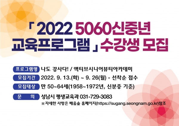 성남시 ‘5060 신중년’ 인생·은퇴 설계 위한 평생교육 강좌 마련