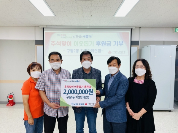 [금요저널] 인천시 남동구 구월2동 행정복지센터는 추석을 맞아 구월2동 자생단체연합회 성금 200만원, 구월2동 사랑의화수분위원회 참치선물세트 32개, 신성교회 백미 10kg 50포 등 이웃을 위한 따뜻한 나눔 행렬이 이어졌다고 13일 밝혔다.