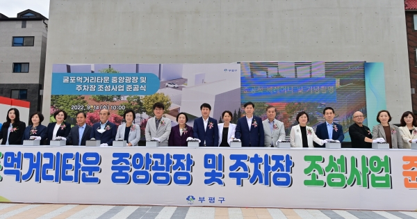 이번 조성사업은 부평구의 도시재생뉴딜사업인 ‘지속가능부평 11번가’ 사업의 일환으로 실시한 것으로 굴포먹거리타운 중앙광장은 이용률이 저조한 어린이 공원을 철거하고 상권 활성화를 위한 집객 시설로 조성했다.