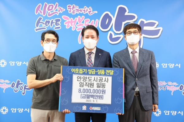 이번 성금은 공사 임직원의 자발적 모금으로 마련된 것이며 성금 전달식에 최대호 안양시장, 이명호 안양도시공사 사장 등이 참석했다.