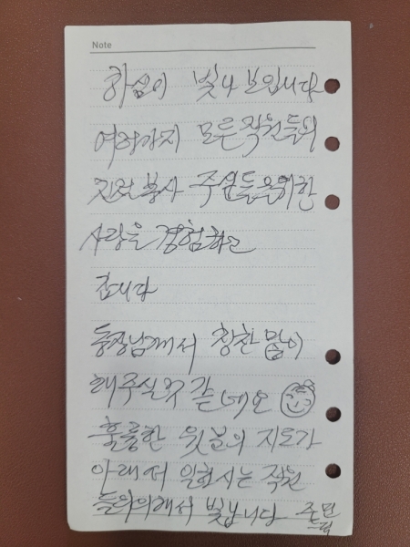 편지에는 “모든 사무실 직원들의 친절한 안내와 도움으로 ‘전기감면 신청’을 무사히 끝냈습니다 친절로 봉사하는 직원들께 감동할 뿐 아니라, 특히 동장님의 지도가 더욱 빛나보였다 특히 주민을 위한 사랑을 경험한 아름다운 순간이었어요. 윗분들의 훌륭한 지도가 직원들에 의해서 더욱 빛납니다 감사한다”라는 내용이 담겨 있었다.