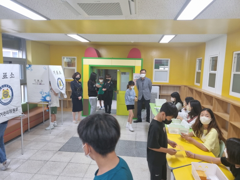 □ 전교학생회 선거에서는 6학년 회장에 5명, 6학년 부회장에 남 1명·여 1명, 5학년 부회장에 남 4명·여 6명이 후보자로 등록하여 교내 게시판에 후보자들의 공약이 담긴 선거 포스터를 게시하였다. 소견발표 영상을 학교 홈페이지에 업로드한 후 4~6학년을 대상으로 현장 투표를 실시하였다.
