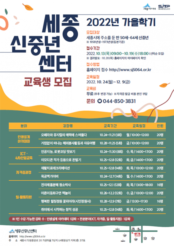 교육생 모집은 2022년 10월 13일 09시부터 19일까지 센터 홈페이지를 통해 선착순으로 진행되며 세종시에 주소를 둔 만 50~64세 누구나 신청할 수 있다.