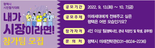 [금요저널] 평택시는 시민과 공무원이 함께 공공서비스를 개발하고 시범운영하는 2022년 시민협치대회 ‘내가 시장이라면’에 참가할 팀을 모집한다.