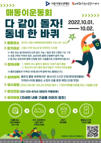 [금요저널] 시흥시와 시흥시청소년재단 소속 매화청소년문화센터는 지역사회 청소년 및 주민들의 친환경 문화 인식을 향상하고자 ‘매동이 운동회, 다 같이 돌자 동네 한 바퀴’를 오는 10월 1일부터 2일까지 총 이틀에 걸쳐 운영한다.