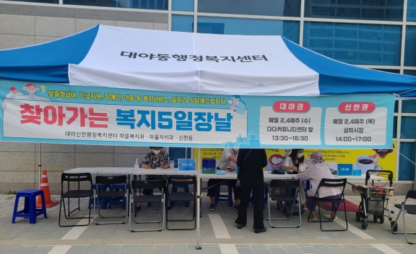 ‘복지 5일장’은 매월 둘째·넷째 주 수·목요일 대야·신천동 내 유동인구가 많은 장소에 이동 상담소를 설치하고 대야·신천 행정복지센터 외 5개 기관과 함께 주민들에게 복지서비스·일자리·건강 상담을 제공하는 사업으로 복지 사각지대를 해소하는 데 주력하고 있다.