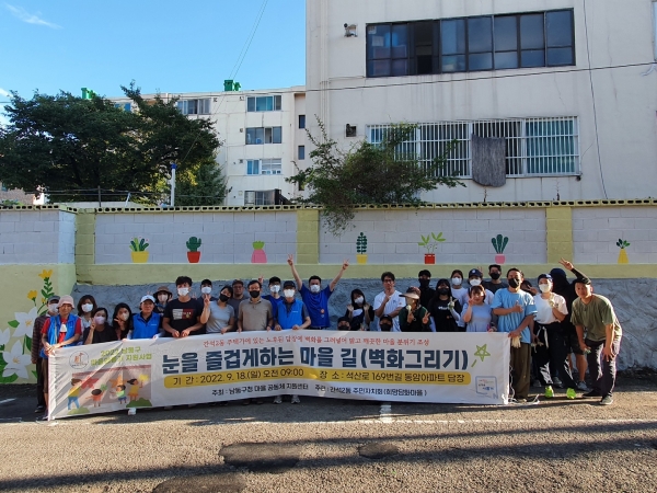 이 사업은 주민자치위원, 동 직원, 우리동네벽화봉사단 등 총 60여명이 참여한 가운데 쾌적한 주거환경을 만들자는 취지로 38년 된 동암아파트 담장에 벽화를 그려 넣었다.