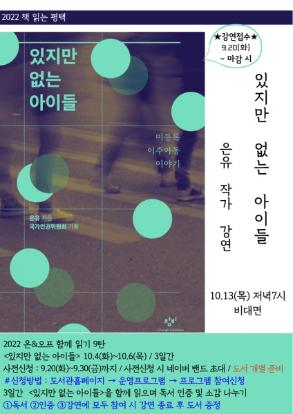 평택시가 선정한 함께 읽는 책 ‘있지만 없는 아이들’은 우리가 미처 알지 못했던 미등록 이주아동에 대한 이야기로 은유 작가가 이주아동과 이주인권활동가 등을 만나 우리가 누리는 평범한 일상조차 누릴 수 없는 그들의 이야기를 전해준다.