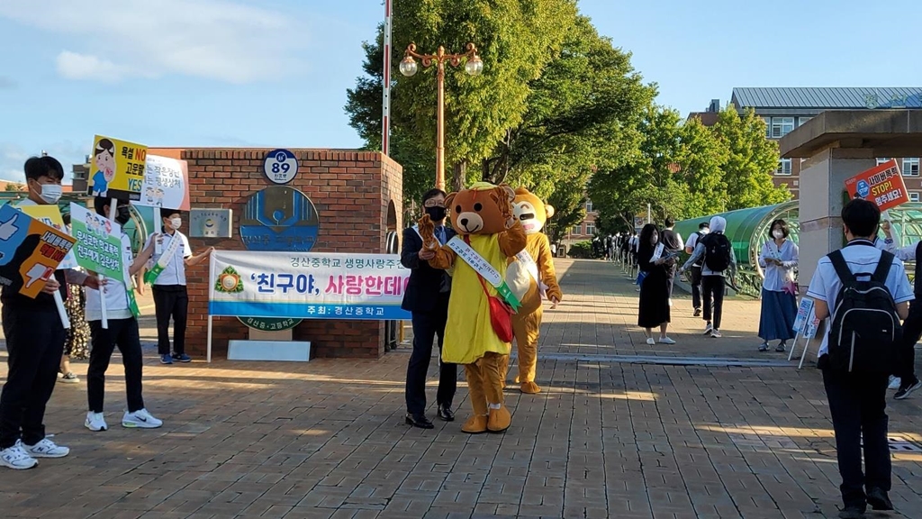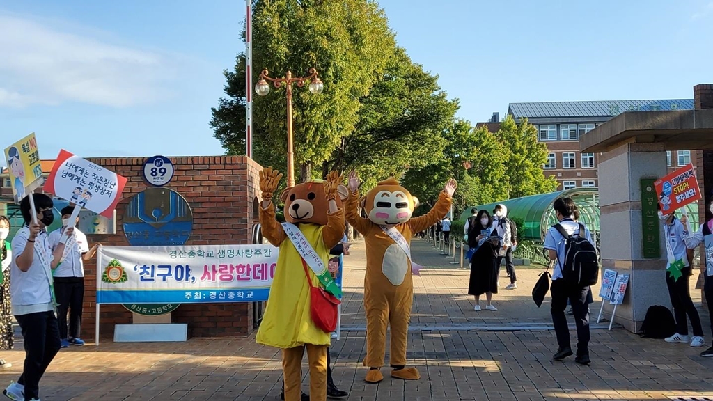 경산중학교(교장 이춘기)는 9월 21일(수) 아침 등교 시간 교문에서 전교생을 대상으로 학생회가 주관하는 ‘생명사랑주간 캠페인’을 실시하였다.