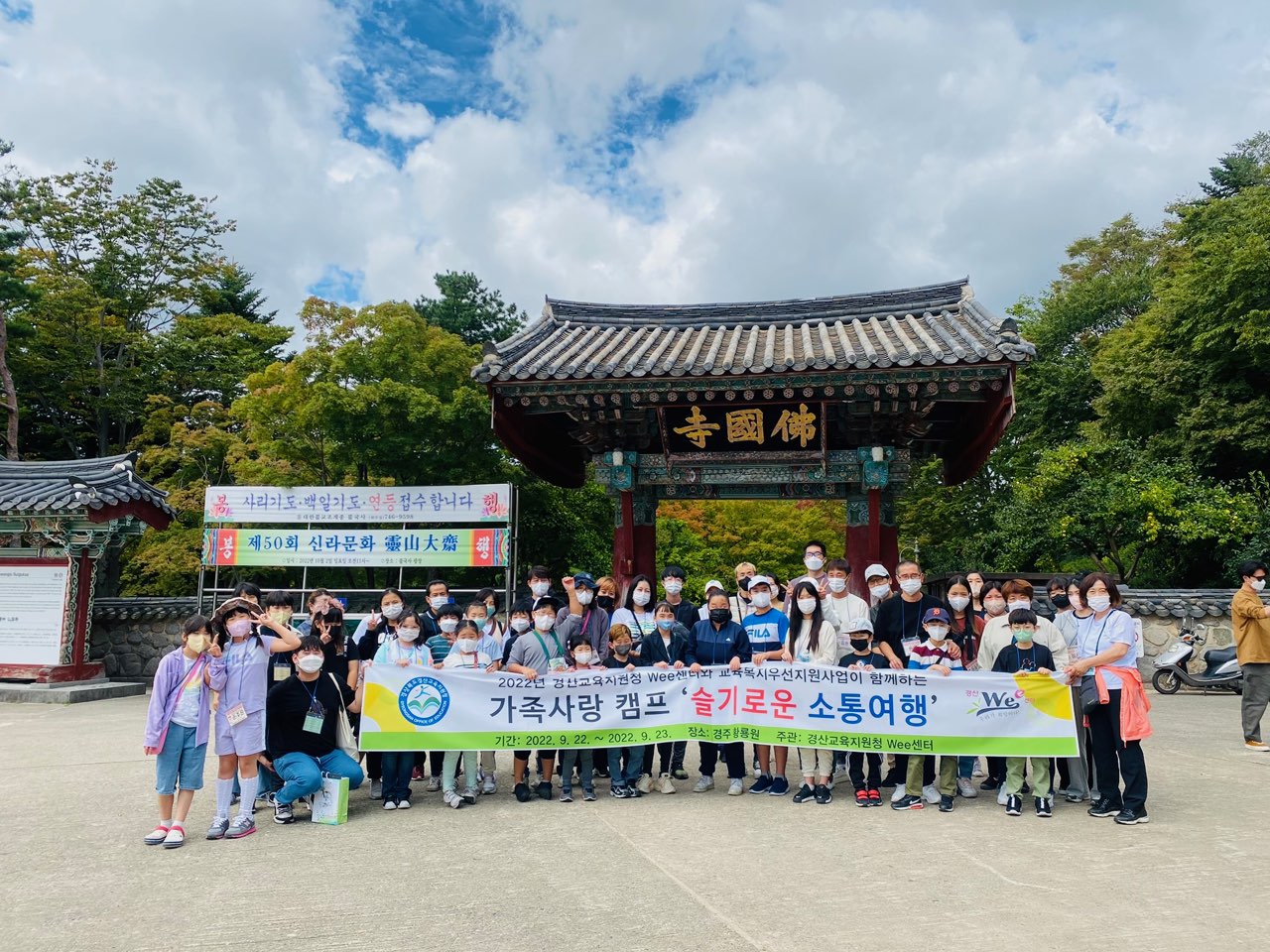 □ 경산교육지원청(교육장 이양균) Wee센터는 2022년 9월 22일(목)~9월 23일(금), 경주 황룡원과 경주 일대에서 경산 관내 초·중학생 및 학부모 47명을 대상으로 경산교육지원청 Wee센터 특색사업인 ‘경산교육지원청 Wee센터와 교육복지우선지원사업이 함께 하는 가족사랑 캠프 슬기로운 소통 여행’을 진행하였다.