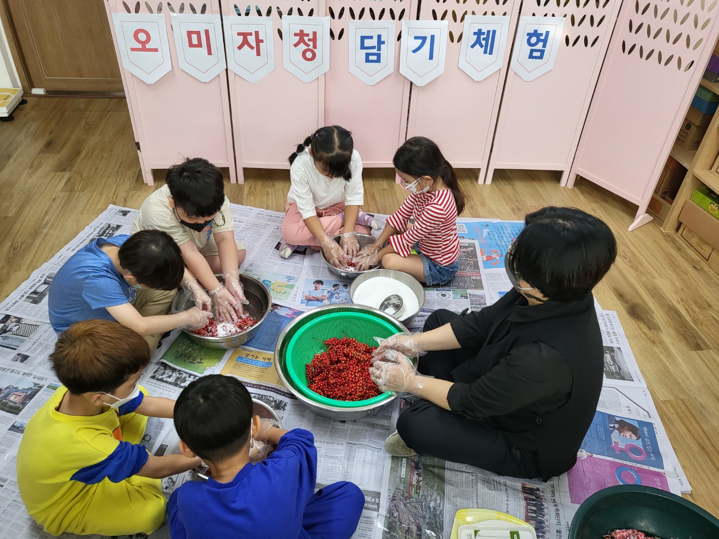 ◆ 또한 건강교육과 연계하여 유치원에서는 ‘오미자청 만들기’활동을 진행하였다. 오미자의 좋은 점에 대해 알아본 뒤 원아들이 직접 손으로 오미자를 다듬고, 청을 만들어보며 건강한 내 몸을 만들기를 실천할 수 있었다.