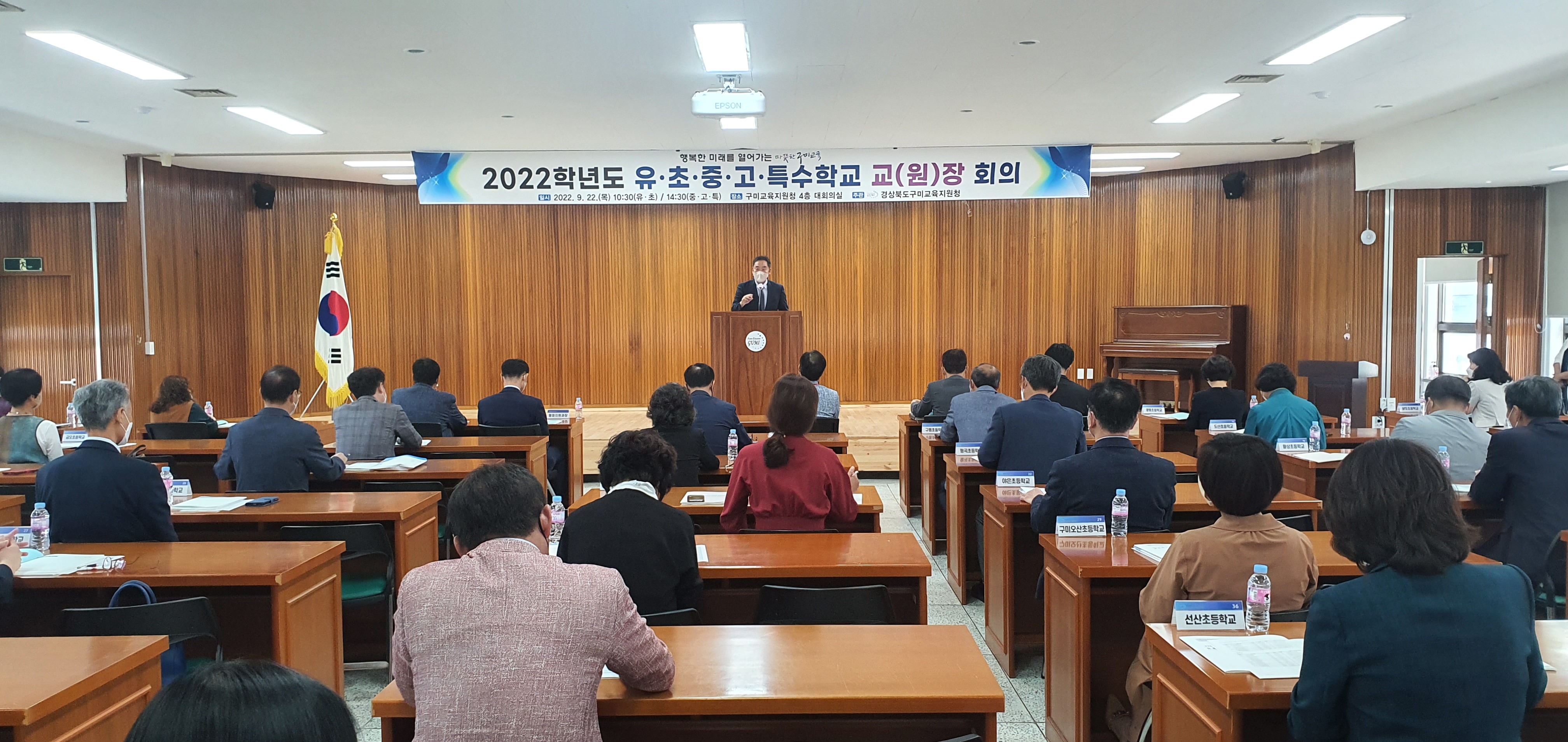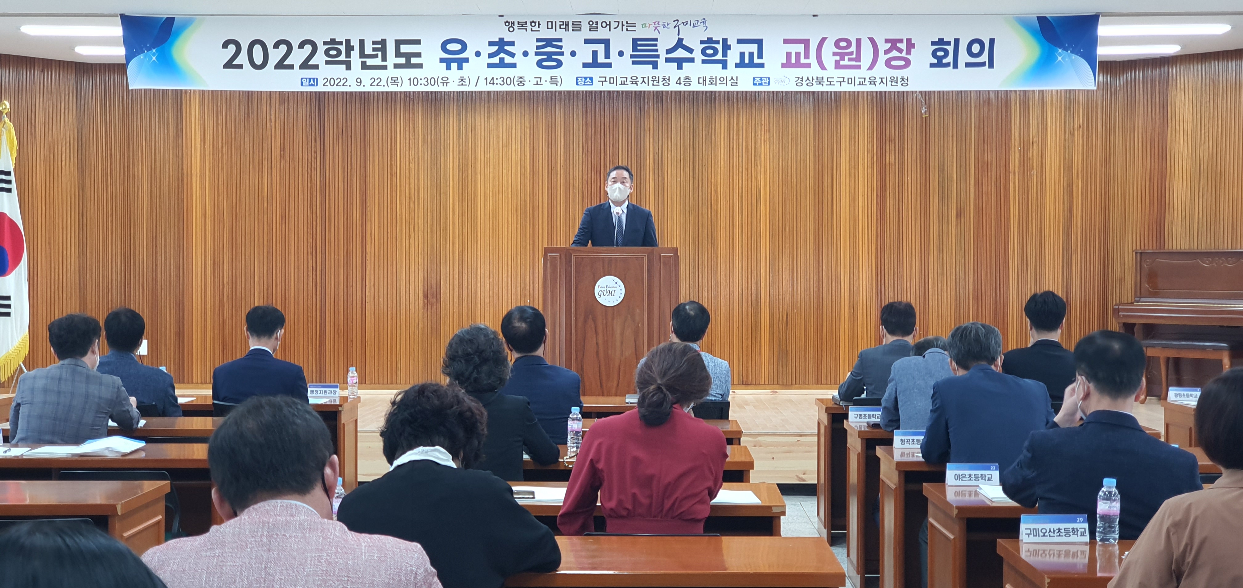 □ 경상북도구미교육지원청(교육장 이성희)은 9월 22일 구미교육지원청 대회의실에서 유, 초, 중, 고, 특수학교 104교 원장 및 교장을 대상으로 2학기 관리자 회의를 개최하였다.