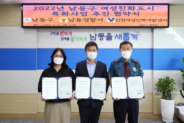 [금요저널] 인천시 남동구는 최근 남동경찰서 인천여성인력개발센터와 여성친화도시 특화사업 추진을 위한 협약을 맺었다고 23일 밝혔다.