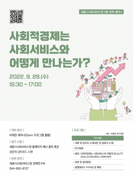 [금요저널] 세종시민의 든든한 일상을 지원하기 위해 설립된 세종특별자치시 사회서비스원은 오는 28일 9월 정책세미나를 개최한다.