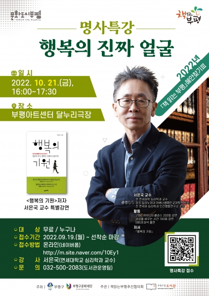 [금요저널] 부평구 구립도서관이 다음달 21일 개최될 명사특강 ‘행복의 진짜 얼굴’ 참여자를 26일부터 선착순으로 모집한다.