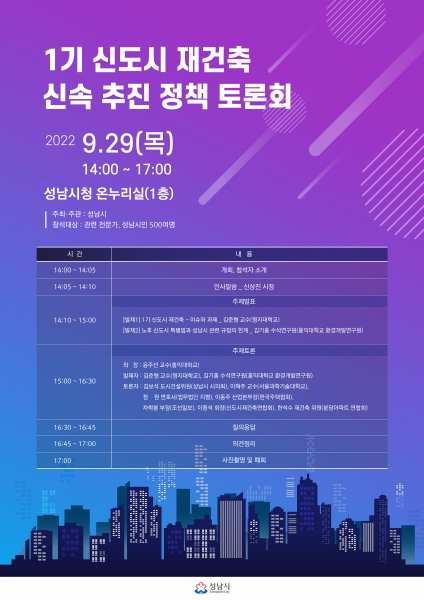 [금요저널] 성남시는 오는 9월 29일 오후 2시~5시 시청 1층 온누리에서 ‘1기 신도시 재건축 신속 추진을 위한 정책토론회’를 개최한다.