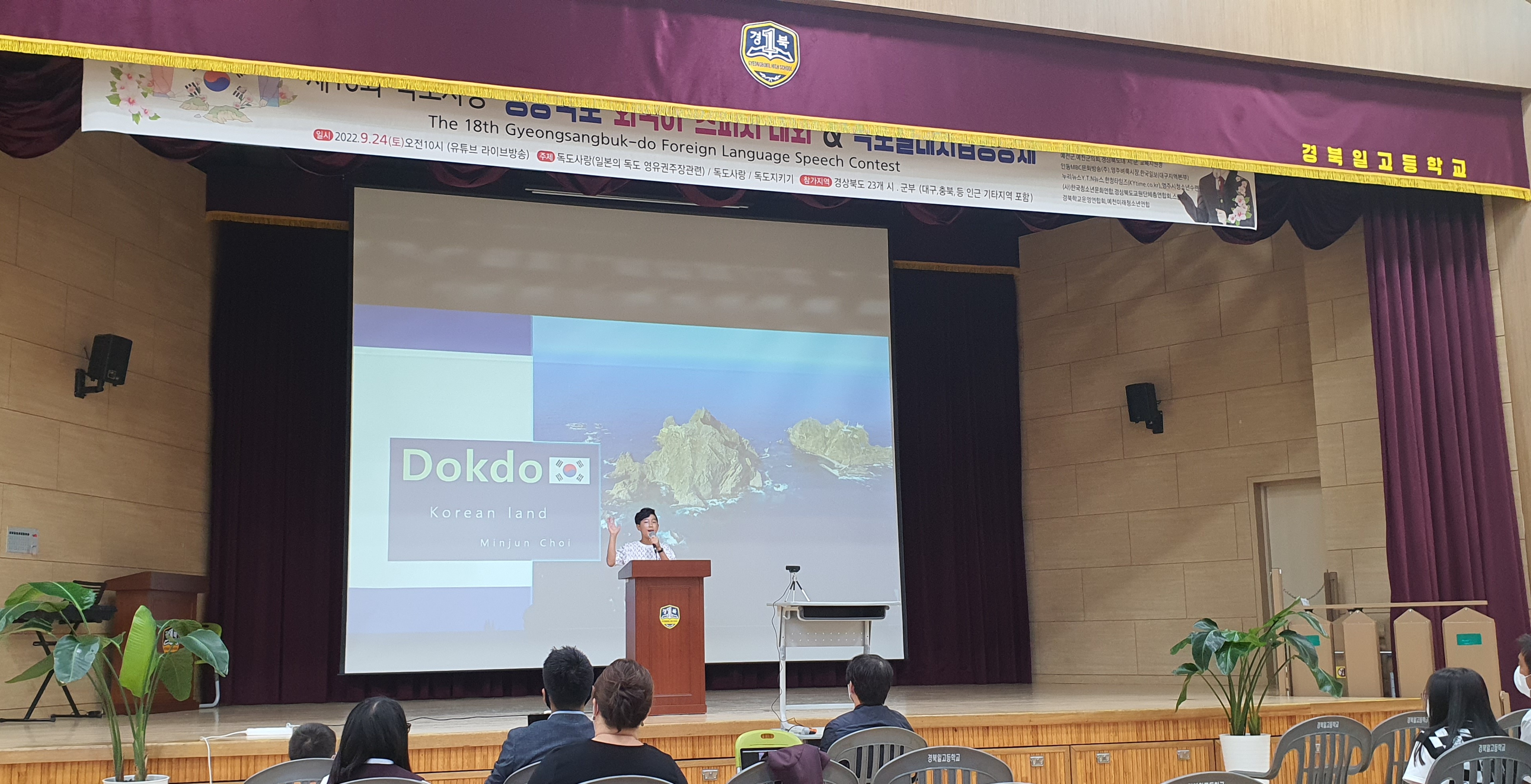 □ 경상북도가 주최하고 경상북도 교육청, 도내 교육지원청 등이 후원하는 2022년 제 18회 독도사랑 외국어 스피치대회가 지난 24일 경북일고등학교 대강당에서 개최됐다. 올해로 18회째 맞이하는 대회는 ‘독도사랑’을 주제로 한 대한민국 유일의 외국어 스피치 경연대회로 매년 참가 학생들의 증가와 함께 대회의 열기가 더욱 뜨거워졌다.
