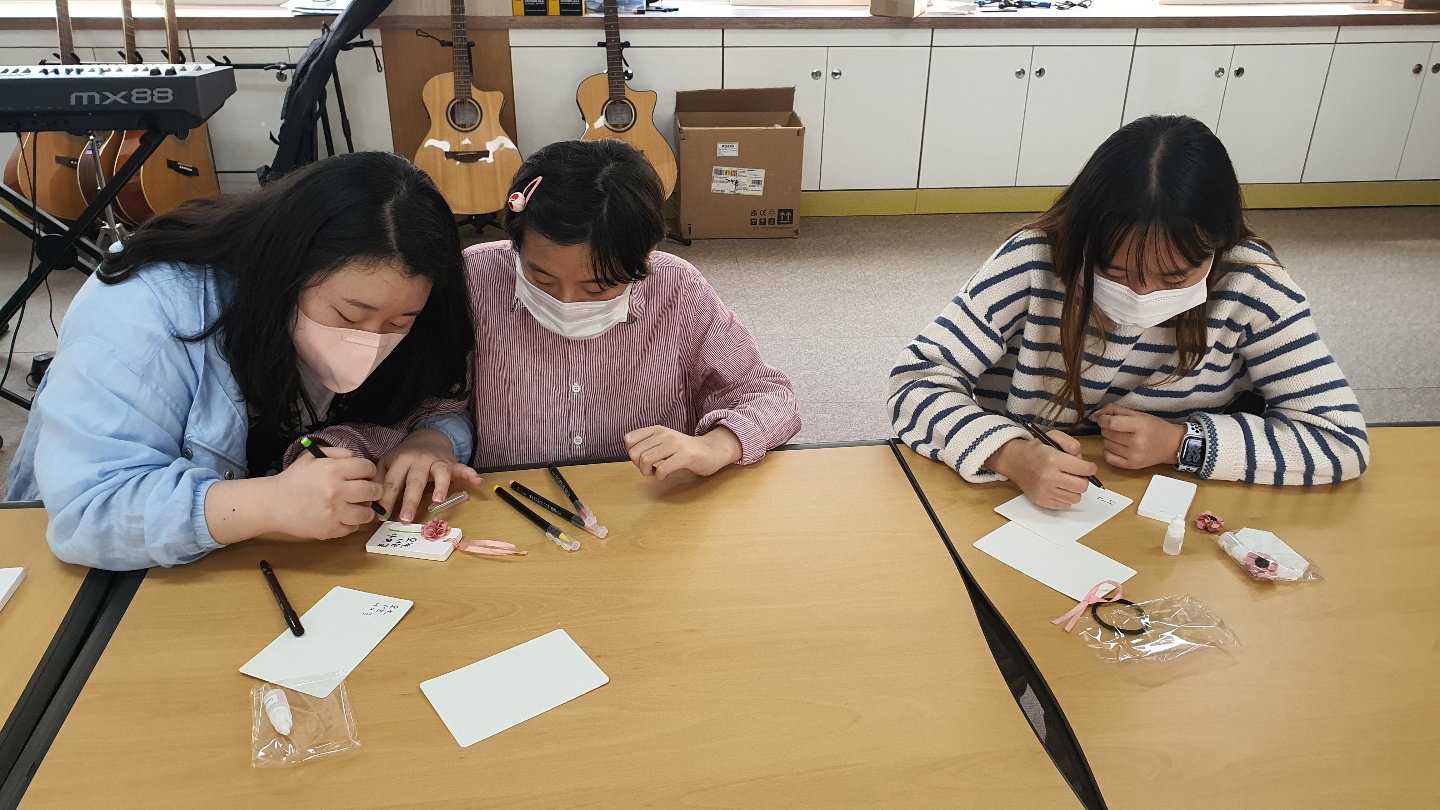 사랑한데이」체험프로그램인 캘리그라피쓰기, 캘리그라피 석고방향제 만들기 활동을 하였다. 바른말 고운말로 친구에게 사랑과 응원의 메시지 써서 선물하는 행사였다.