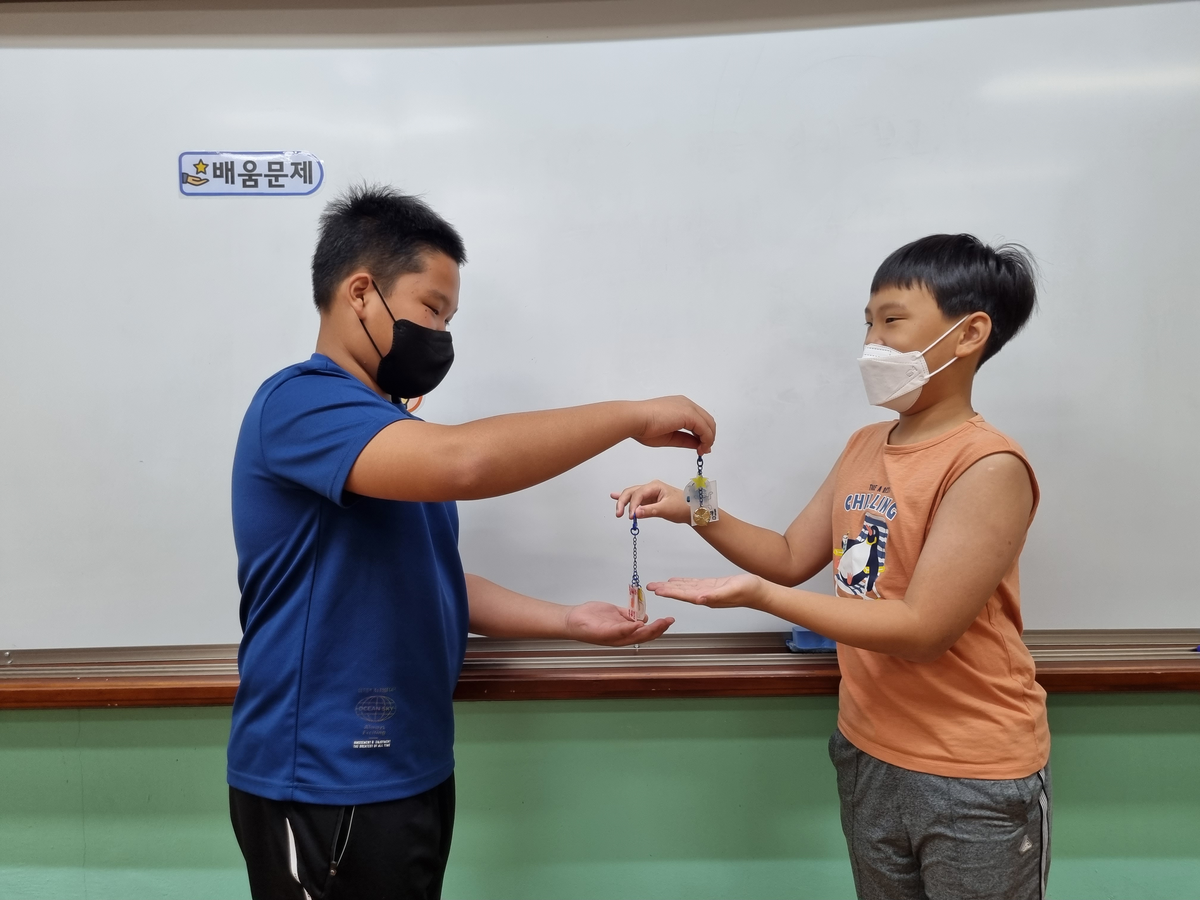□ 또한, 열을 가하면 크기가 작아지고 단단해지는 슈링클즈 종이를 활용하여 키링을 만들어 친구에게 선물하는 활동을 하였다. 직접 그림을 그리고 글을 써서 만든 키링에 사랑과 감사의 마음을 담아 서로 교환하면서 앞으로의 우애를 다질 수 있는 활동이었다.