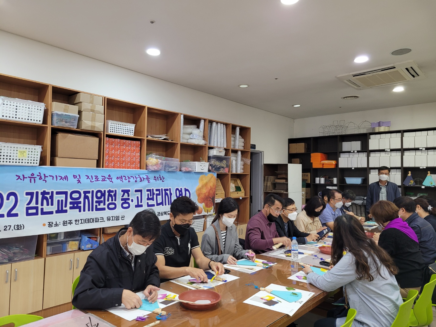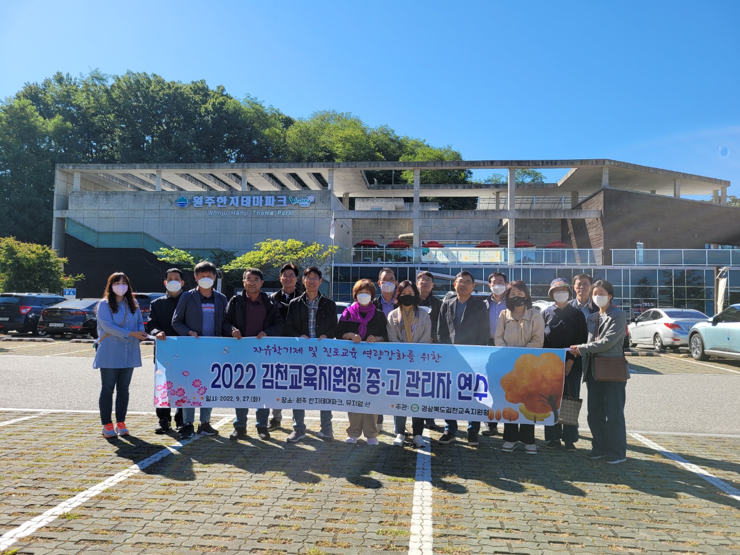 경상북도김천교육지원청(교육장 박삼봉)은 2022년 9월 27일(화) 원주 한지테마파크 및 뮤지엄 산에서 관내 중·고등학교 관리자를 대상으로 ‘2022 자유학기제 진로교육 관리자 역량강화 연수’를 실시하였다.
