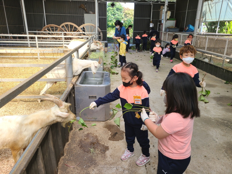 □ 체험학습장에 도착한 유아들은 고구마 캐기 방법 및 동물 먹이 주기 체험 시 지켜야 할 안전 규칙에 대해 먼저 알아본 후 체험을 시작하였다. 유아들은 손으로 직접 고구마 줄기와 비닐을 제거한 후 모종삽을 이용하여 땅속 고구마 캐기 체험을 실시하였다. 또한 농장에 있는 말, 양, 염소, 토끼 등 다양한 동물들에게 고구마 줄기 먹이 주기 체험, 블루베리 철판아이스크림 만들기 체험도 즐겁게 실시하였다.