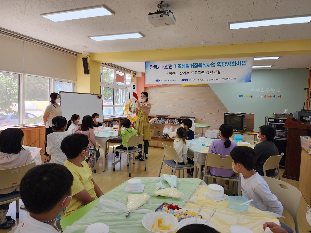 안동 녹전초등학교(교장 문순금)는 9월 8일(수) 유치원~6학년 22명과 함께 쿠킹클래스(케이크, 쿠키 만들기) 체험을 실시했다. 이번 체험 프로그램은 한국농어촌공사 안동지사와 경북미래전략 비전연구소에서 녹전마을 역량강화사업의 일환으로 후원을 받아 실시한 3회차 프로그램이다.