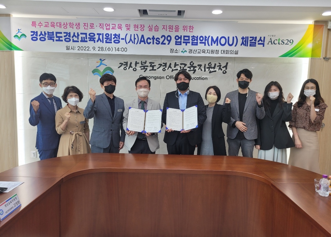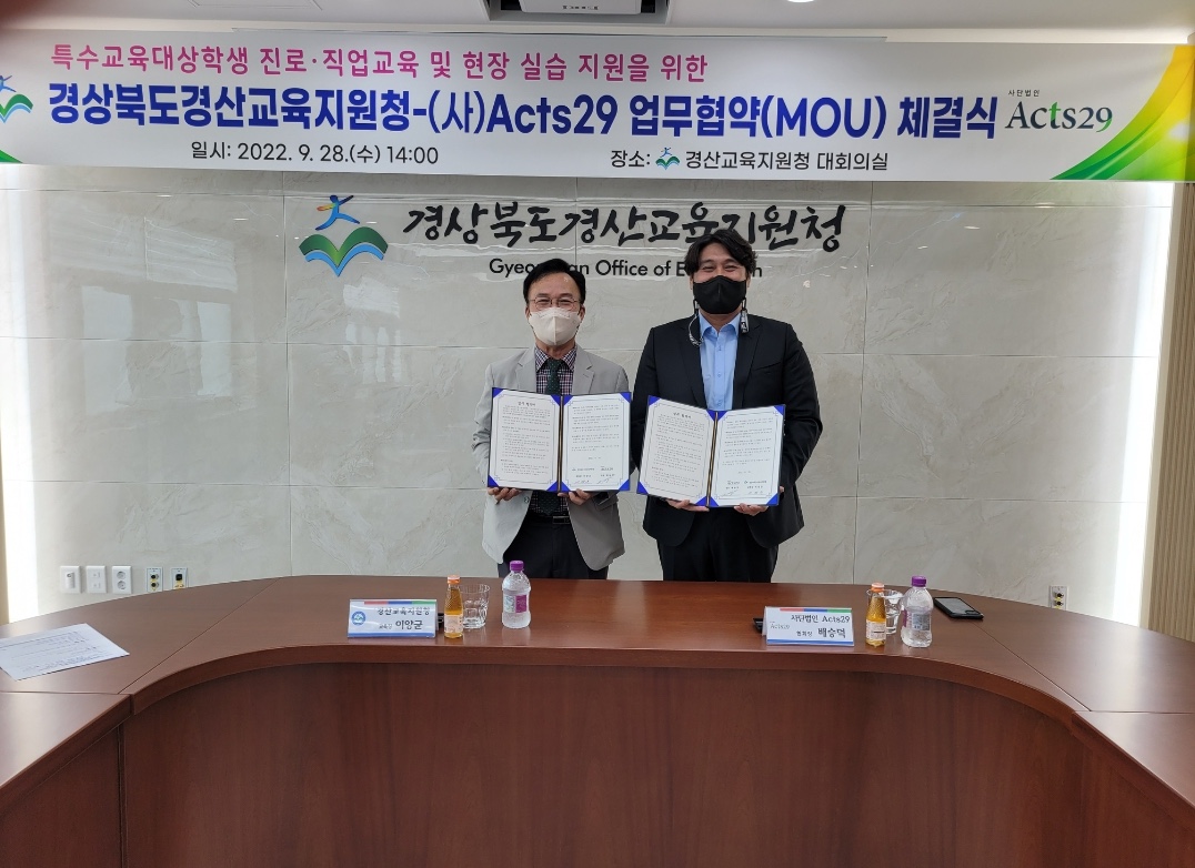 □ 경산교육지원청(교육장 이양균)은 9월 28일 경산교육청 대회의실에서 사단법인 Acts29(아시아스페셜티커피협회장 배승덕)와 특수교육대상학생의 바리스타 자격취득 과정 및 직무훈련 지원을 위한 업무협약을 체결했다.
