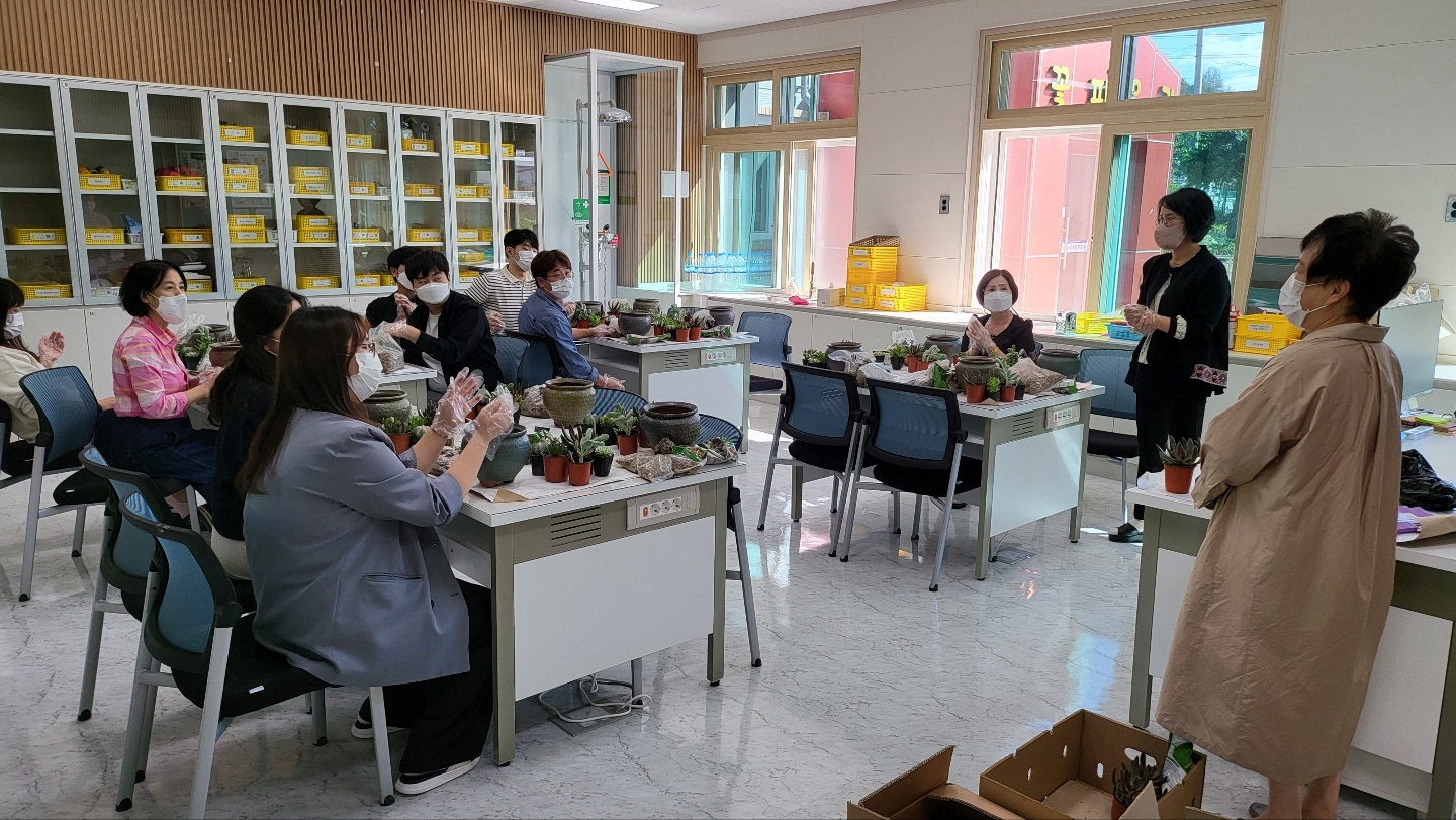 다육식물심기 힐링 프로그램은 교원 심리 회복 프로그램 중 하나로 교원의 신체·정신 건강 증진을 위한 치유 및 소통을 위해 운영하였다. 교원, 일반행정직, 교육공무직, 조리직 모두 함께 참여하여 더욱 의미있는 시간이 되었다.