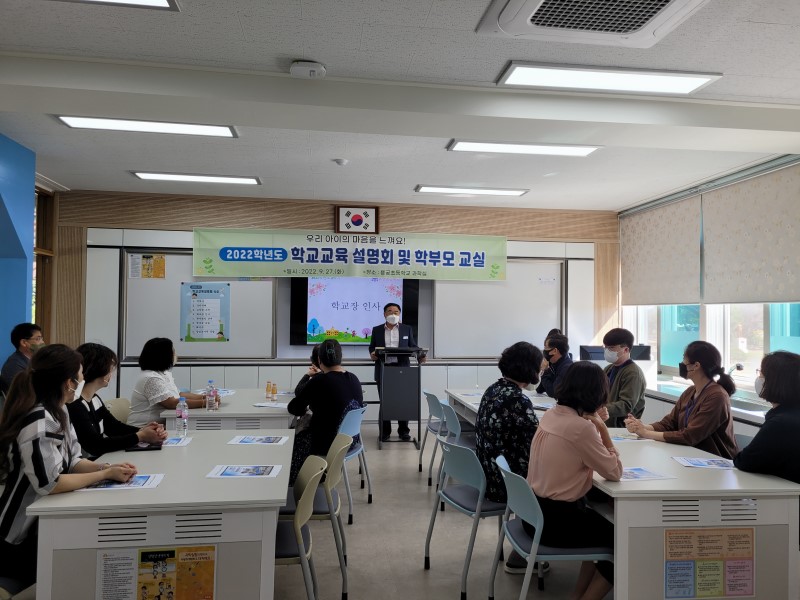 용궁초등학교(교장 조성래)는 9월 27일(화) 14시부터 본교 과학실에서 2022학년도 2학기 학교교육설명회 및 학부모 교육을 실시하였다. 이 날 행사는 입장 시 발열 체크, 손 소독, 마스크 착용 등 철저한 방역 지침 준수 하에 진행하였다.