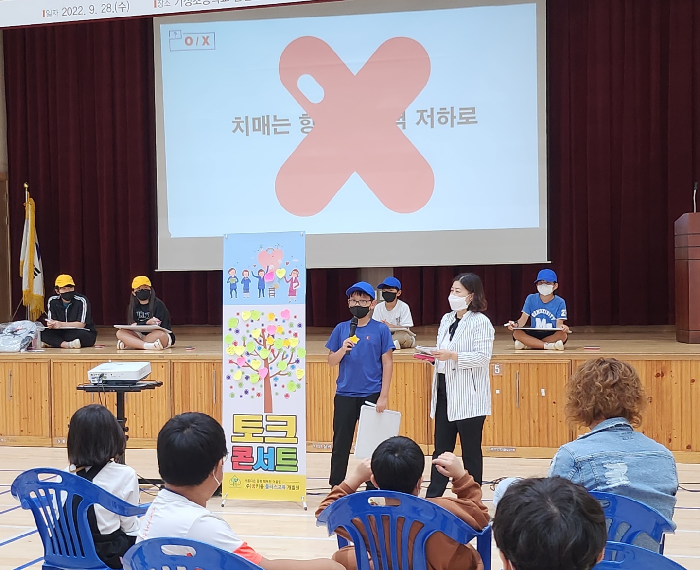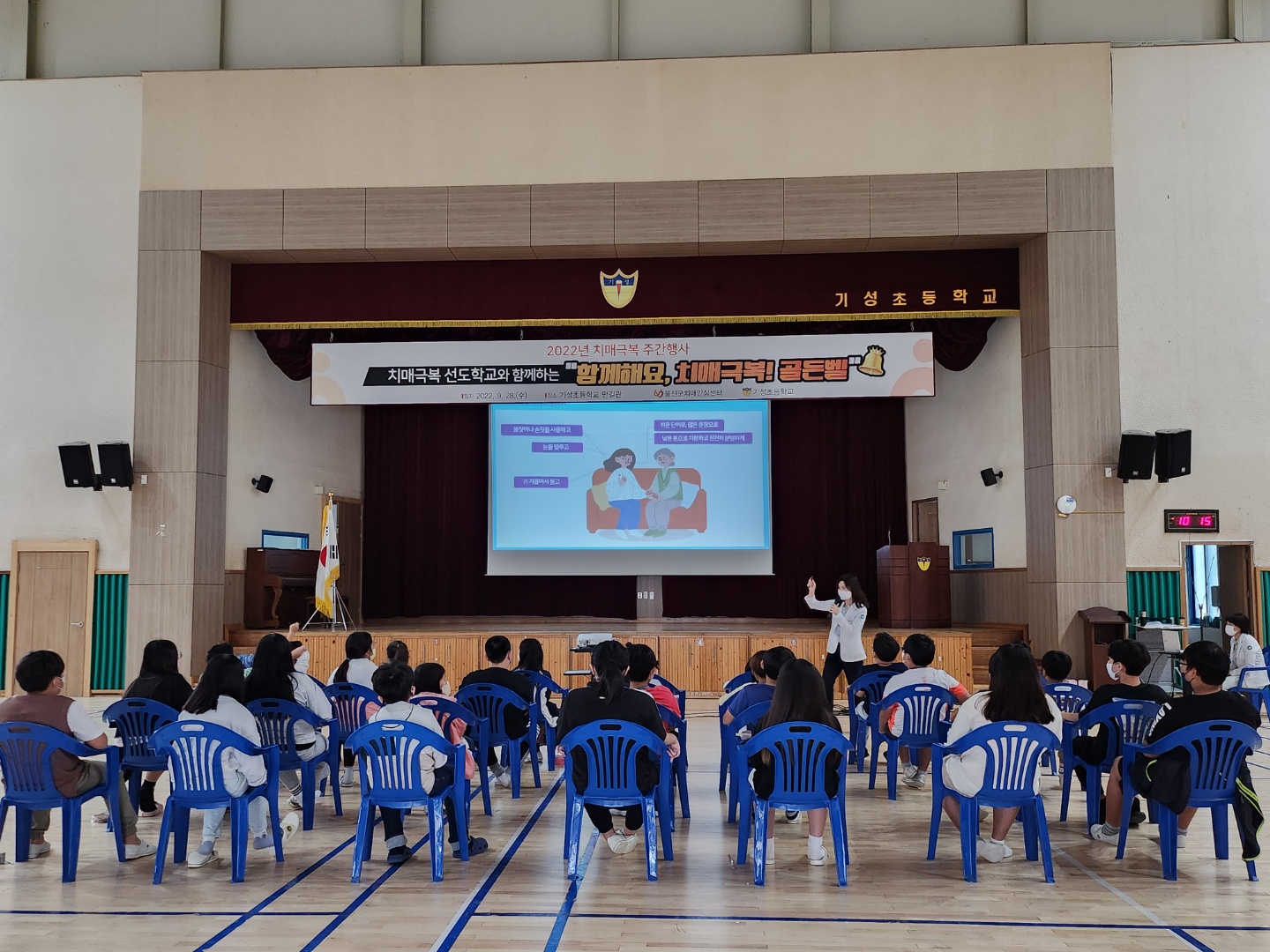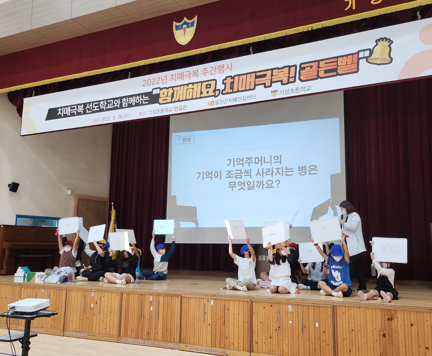 □ 기성초등학교(교장 도중권)는 2022년 9월 28일 기성초등학교 만길관에서 울진군보건소 치매안심센터 사례관리팀 전문가를 초청하여 치매 파트너 양성 교육과 ‘2022년 함께해요, 치매극복! 골든벨’을 열었다. 기성초는 2020년 치매 안심 마을을 형성하기 위해 치매극복선도학교로 지정되었으며 매년 치매파트너를 양성하는 행사와 프로그램을 운영하고 있다.