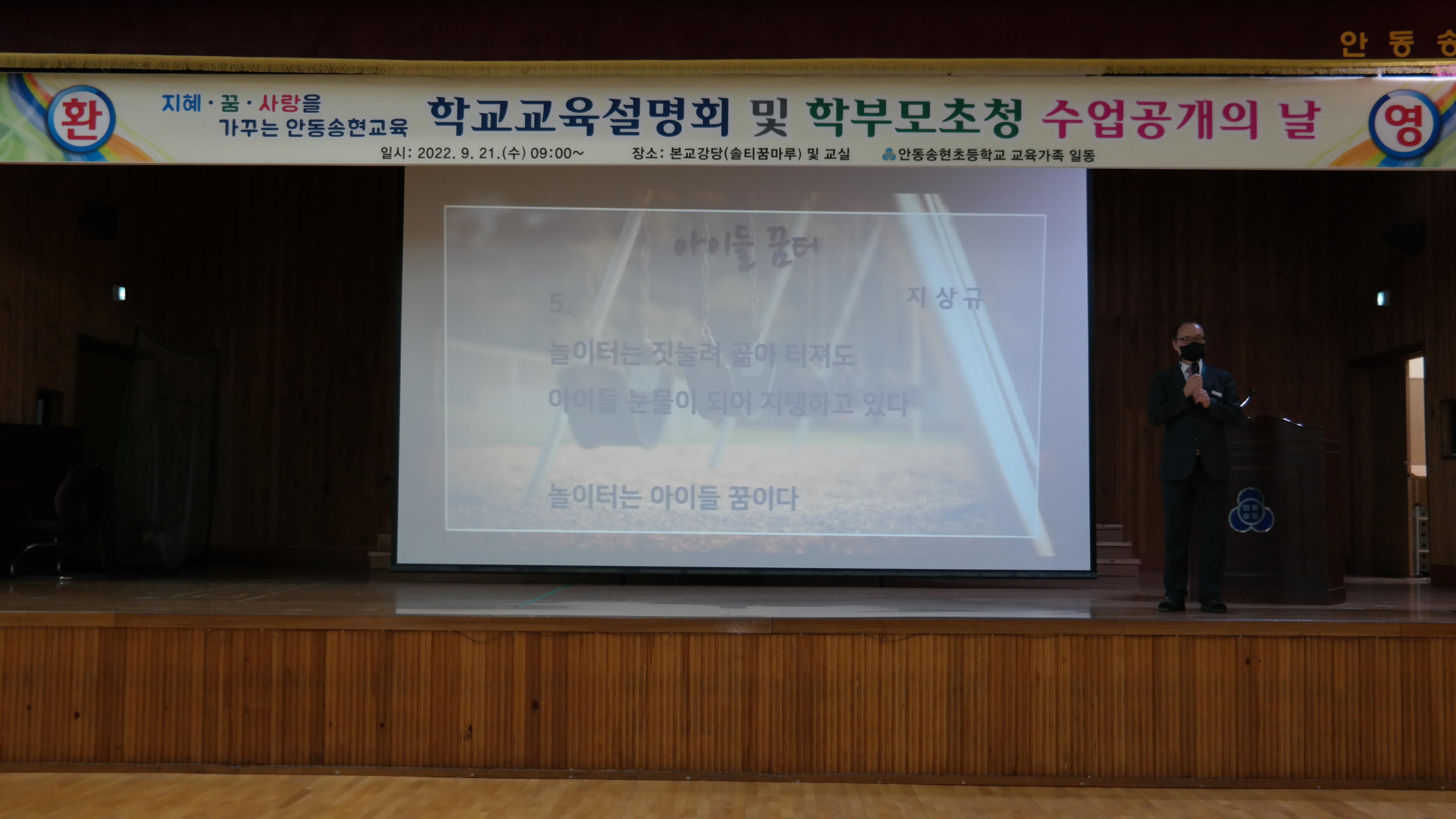 - 안동송현초등학교(학교장 지상규)는 2022. 9. 21.(수)에 2학기 학교교육설명회 및 학부모초청 수업 공개를 실시하였다. 학교 교육 설명회를 통해 코로나19로 어려웠던 학부모님의 학교 교육 참여를 활성화하고, 학교와 가정 간의 소통 강화를 위해 대면 방식으로 운영하였으며 200여명의 학부모님이 설명회에 참석하셨다.