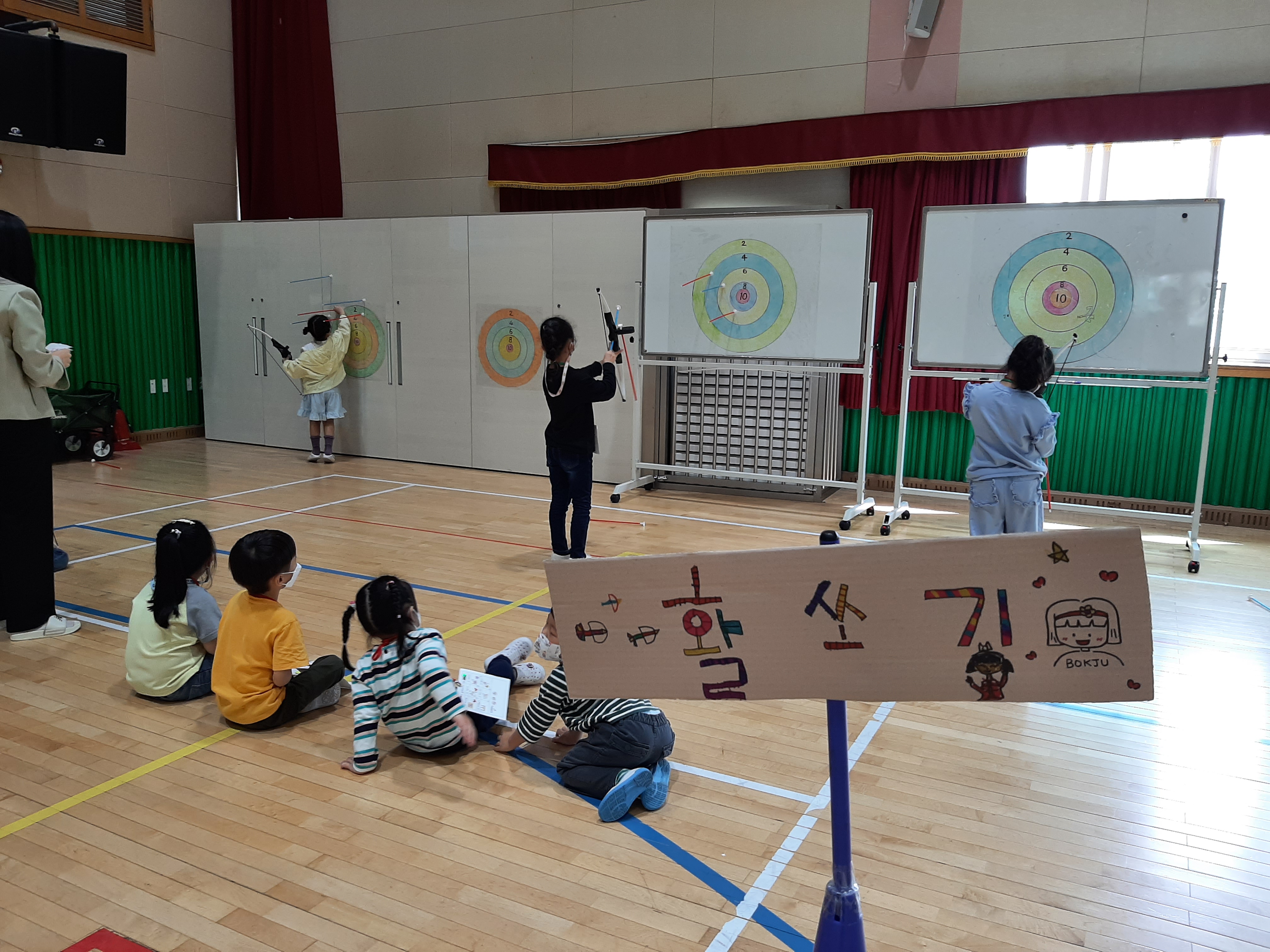 ⃞ 전통 놀이터에서는 비석 치기, 고무줄놀이, 돼지 씨름, 구슬치기, 사방치기, 활쏘기 등 유아들이 흥미 가질 수 있는 전통놀이로 구성되었다. 이날 유아들은 다양한 전통놀이 체험에 즐겁게 참여하며 뜻깊은 시간을 가졌다.