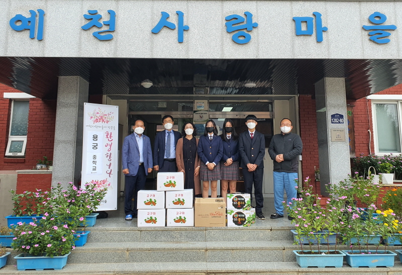 고구마 수확 활동에 참여한 1학년 신00 학생은 “집에서 평소 부모님을 도와 고구마를 수확한 적이 있는데, 오늘 친구들과 함께 하니 더 재미있었어요. 제가 직접 수확한 고구마를 복지시설에 나누어 준다고 생각하니 뿌듯해요.”라고 말하였다. 용궁중학교 학생회는 9월 29일(목) 용궁면 복지시설 ‘예천사랑마을’을 방문하여 학생들이 수확한 고구마와 학생회에서 준비한 간식을 전달하였다. 학생회장 권00 학생은 “우리들 손으로 직접 수확한 고구마를 지역의 복지시설에 나눠주는 것을 통해 나눔의 방법을 배울 수 있었다.”라고 소감을 전하였다.