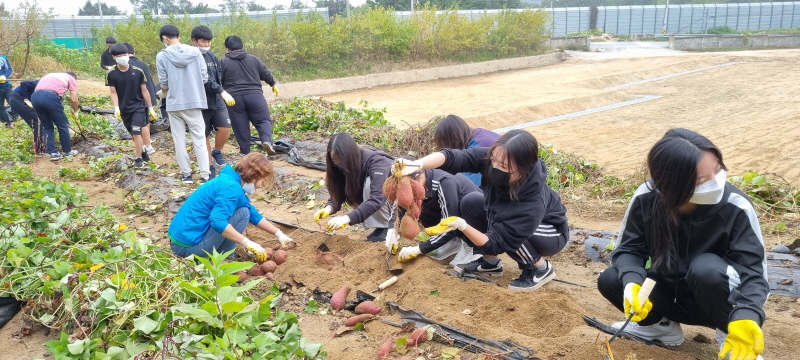 용궁중학교 학생들은 올해 봄 학교 텃밭에 심은 고구마를 수확하였다. 교직원은 체험활동에 앞서 고구마 넝쿨을 걷어내고, 안전교육 및 고구마 캐기 요령 등을 설명하며 원활한 진행을 도왔다. 학생들은 호미를 이용해 고구마를 직접 수확하고, 선생님, 친구들과 함께 어울려 수확의 기쁨을 느끼는 행복한 시간을 가졌다.