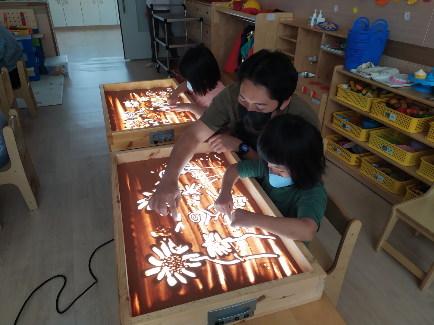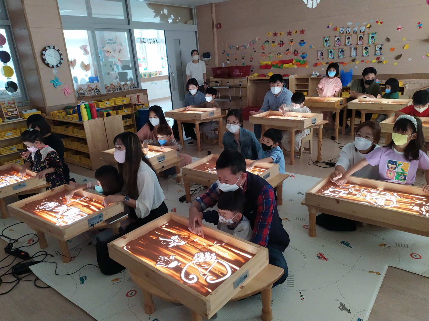 □ 이번 부모참여 샌드아트 체험활동은 유아와 학부모의 행복감 증진 및 양육스트레스 해소를 위한 프로그램으로, 아이와 부모가 함께 부드러운 모래를 만지며 놀이하는 신기한 샌드아트 공연을 관람하며 즐겁고 행복한 시간을 보낼 수 있도록 마련하였다.