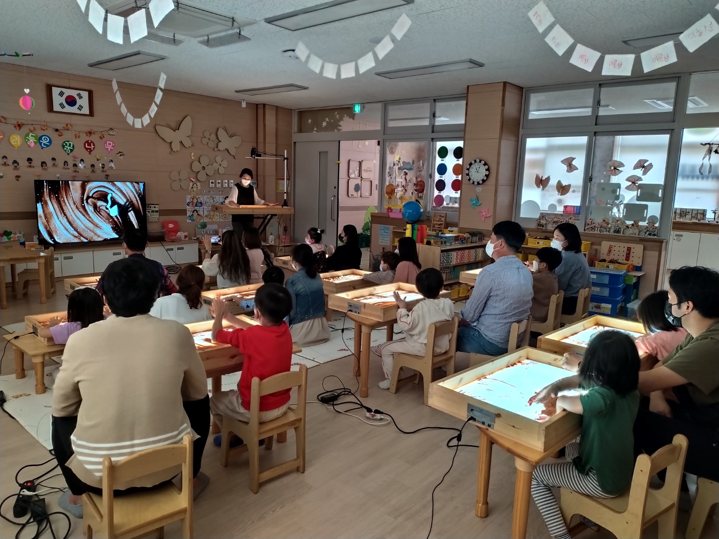 □ 부모님이 유치원에 오신다는 소식으로 들뜬 유아들은 부모님을 만나자 반가운 마음에 꼭 안아드리며 사랑하는 마음을 표현하였다. 가족이 모두 도착한 뒤 샌드아트 전문가의 시시각각 변하는 신기한 샌드아트 그림을 감상하며 유아와 부모님은 직접 모래를 만지고 문지르거나 뿌리며 모래의 느낌을 탐색하였다. 그리고 다양한 샌드아트 기법을 배워 함께 모래 그림을 그려보는 체험을 하면서 즐거운 시간을 보냈다.