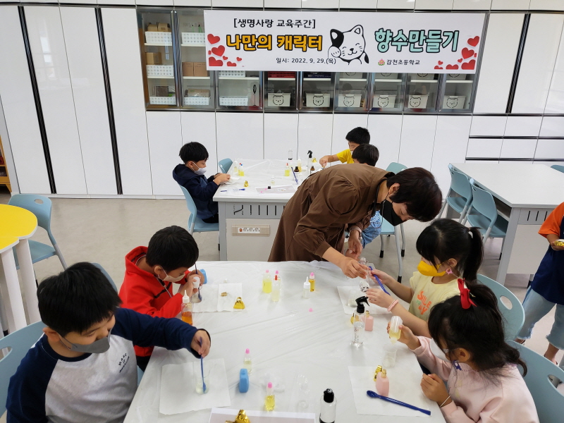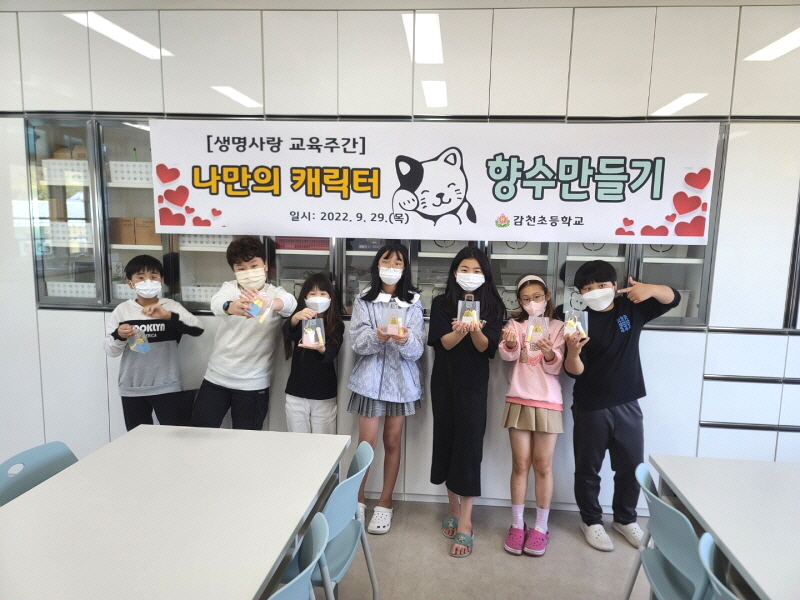 ☐ 감천초등학교(교장 이수갑)은 9월 29일(목) 전교생 48명은 본교 과학실에서 ‘나만의 캐릭터 향수 만들기’ 체험을 하였다.