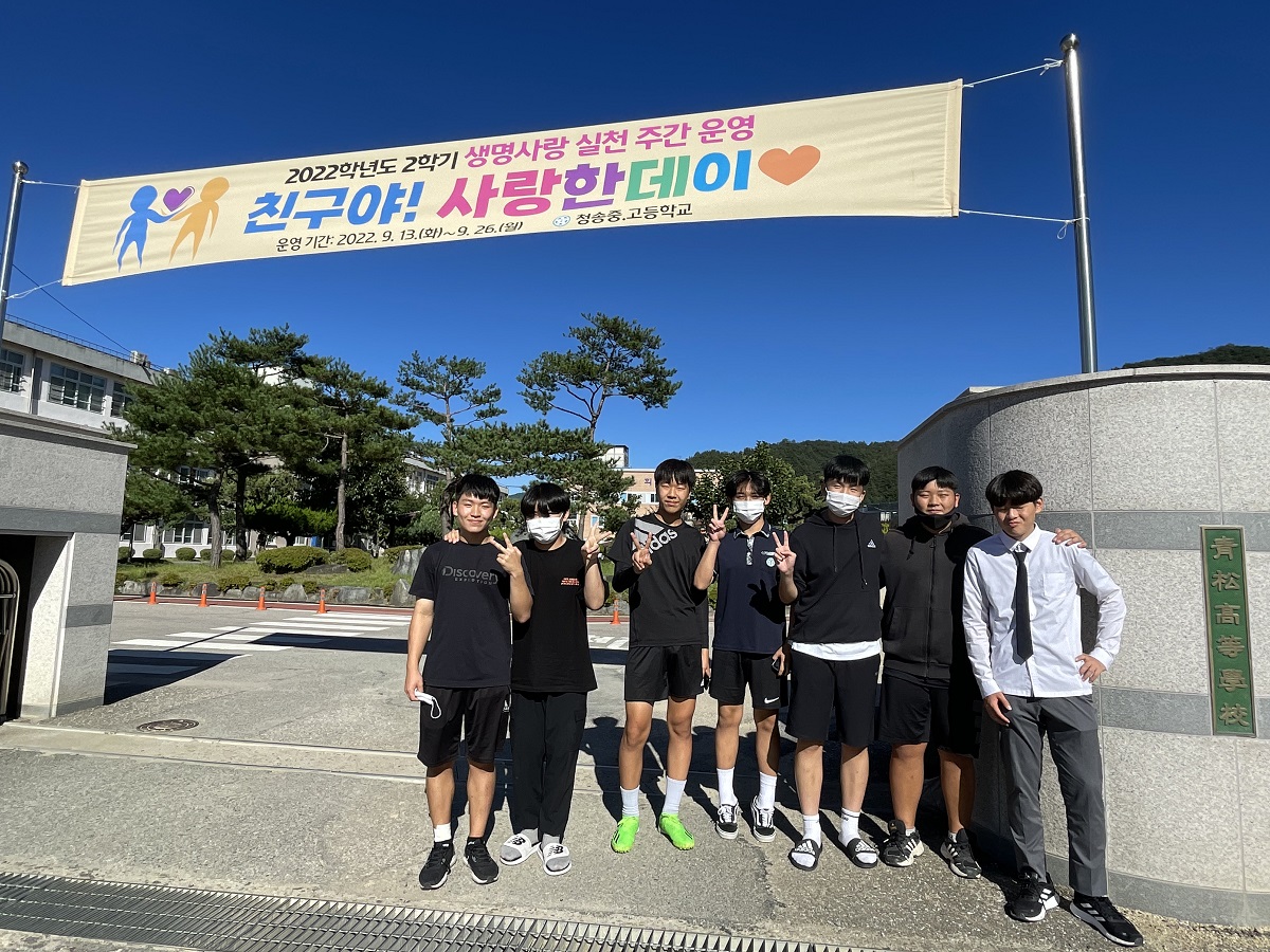 □ 청송중·고등학교(교장 조충래)는 지난 10일 세계 자살 예방의 날을 맞아 전교생과 교직원을 대상으로 9월 13일(화)부터 9월 26일(월)까지 친구 사랑 실천을 통해 생명존중 문화를 확산시키기 위해 ‘친구야 사랑한데이!’를 운영하였다.