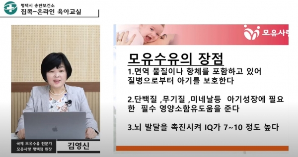 이번 온라인 교육에 참여한 한 대상자는 “코로나19로 인해 대면교육에 갈 수 없어 아쉽지만, 평소에 관심이 많았고 듣고 싶었던 교육인 모유수유를 주제로 한 영상으로 많이 배울 수 있어 좋았다”고 말했다.