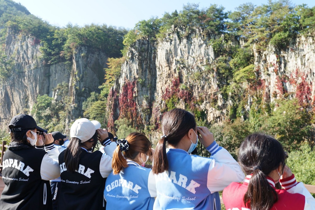 □ 이날 5, 6학년 학생들은 교실수업을 통해 학습한 주왕산과 그 주변의 지질 명소를 방문하였다. 주왕산에 도착한 학생들은 기암단애, 주방천 페퍼라이트, 급수대 주상절리, 용추협곡, 용연폭포, 연화굴 순으로 탐방활동을 진행하였으며, 수업을 통해 공부했던 내용들을 떠올리며 망원경과 카메라 등을 이용하여 각 지질명소의 모습을 자세히 관찰하고 탐사하였다.