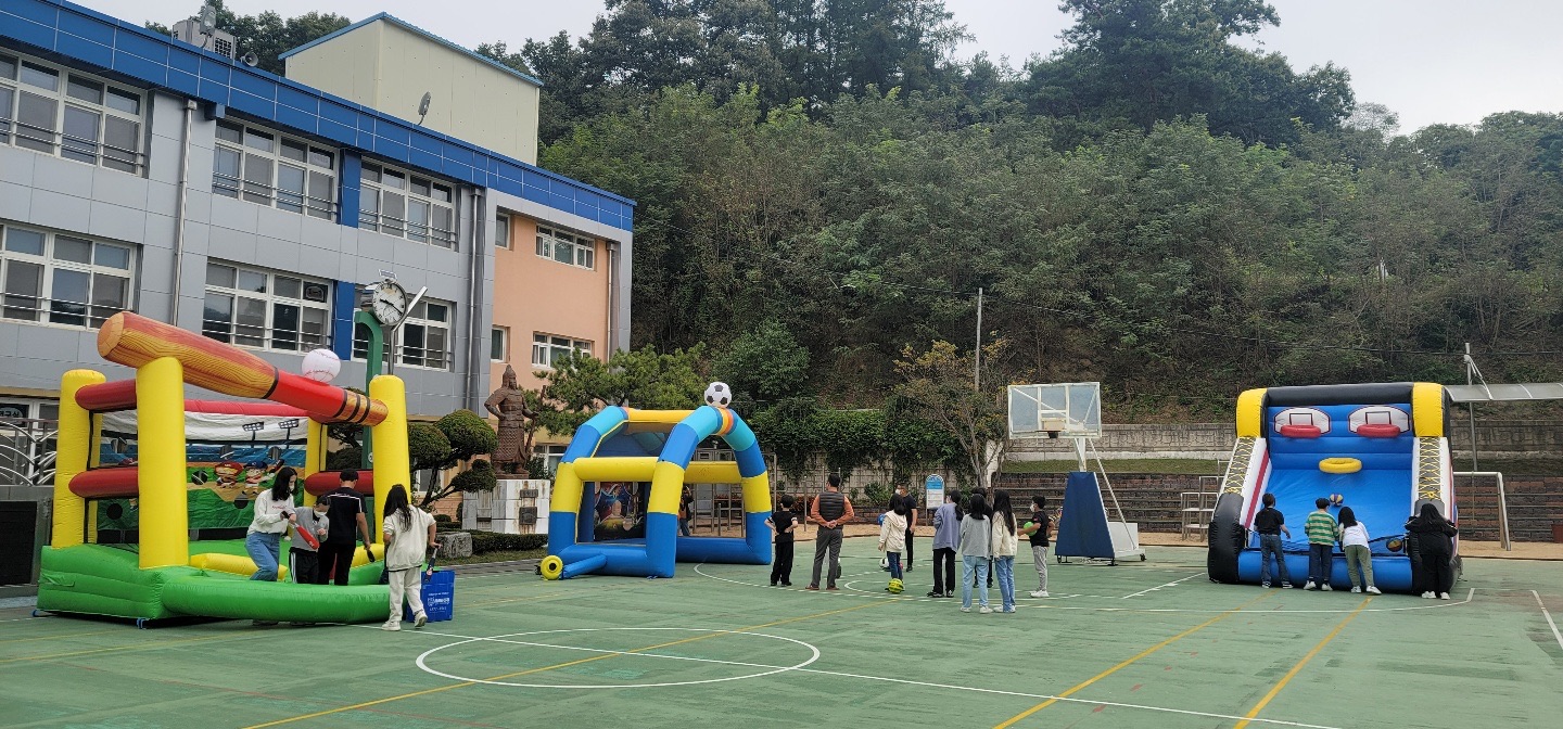 강당 전체에 챌린지 에어바운스5종을 설치하여 학생들이 음악에 맞춰 신나게 점프, 덤블링, 클라이밍, 미끄럼틀 등의 신체활동을 할 수 있도록 하였으며, 운동장에는 스포츠 에어바운스 3종을 설치하여 야구, 농구, 축구를 게임 형태로 체험해 볼 수 있도록 하였다.