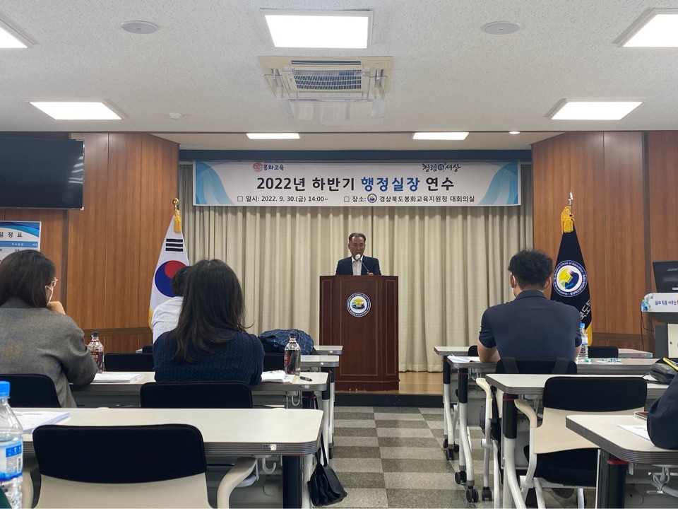 □ 봉화교육지원청(교육장 박명호)은 30일, 청사 대회의실에서 소속기관(봉화도서관)·유·초·중학교 행정실장 22명을 대상으로 2022년 하반기 행정실장 연수를 실시하였다.