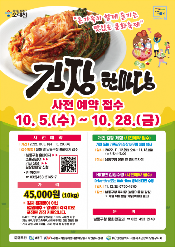 [금요저널] 인천시 남동구는 11월 12~13일 남동구청 중앙광장에서 ‘제4회 남동구 소래찬 김장한마당’ 행사를 개최한다고 4일 밝혔다.