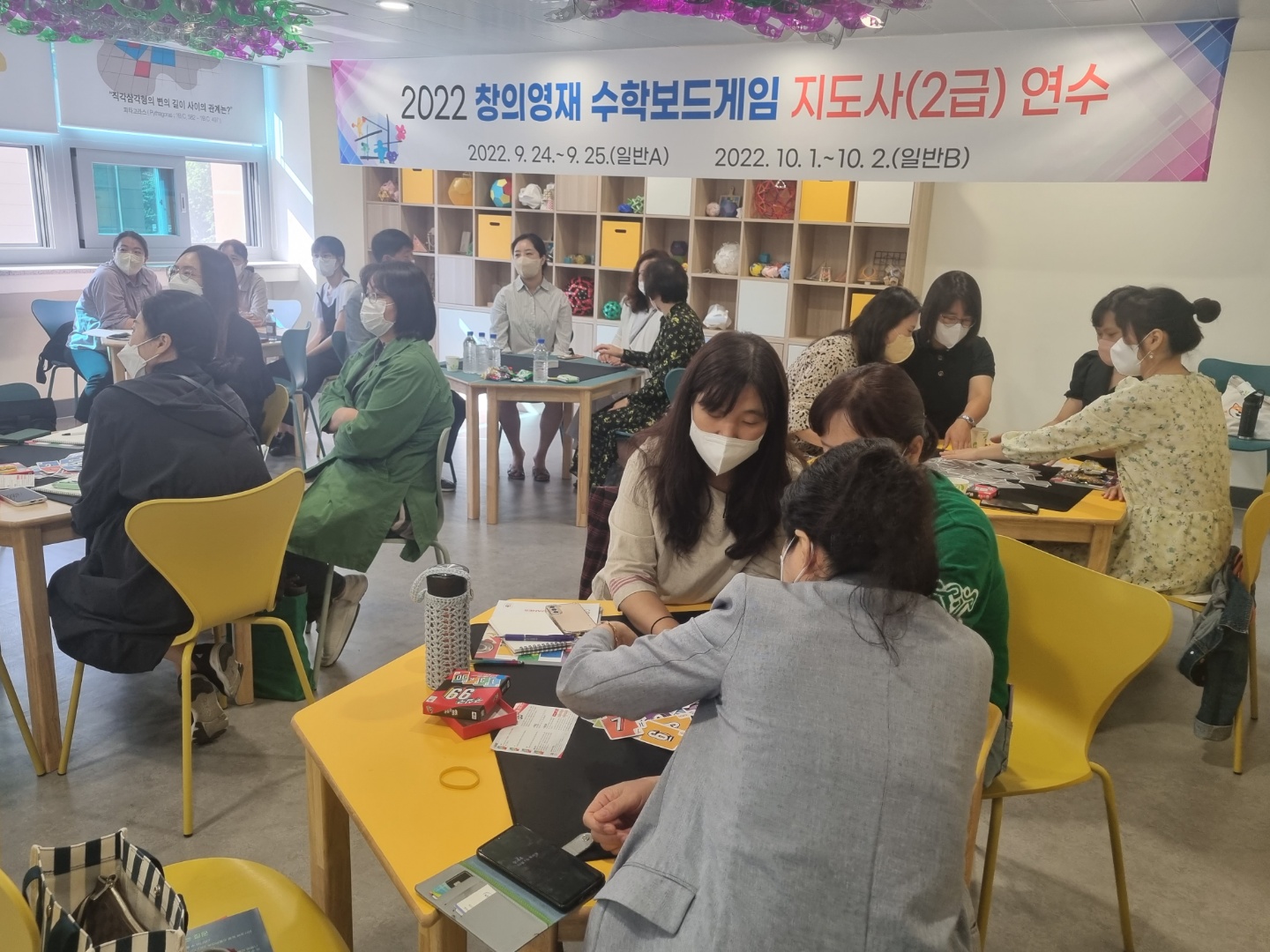 □ 경상북도교육청 경산수학체험센터에서는 전국 교육기관 최초로 9월 24일, 25일과 10월 1일, 2일 총 4일간 경북 중등교사, 초등교사, 일반인을 대상으로 창의영재 보드게임 지도사(2급) 연수를 진행하였다. 이번 연수로 초등교사 23명, 중등교사는 25명, 일반인 36명으로 총 84명이 참여하여 2일 동안 뜨거운 열정을 보여주었다.