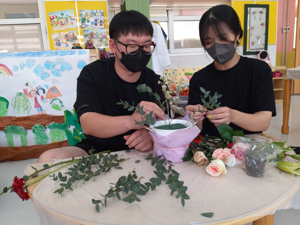 이어서 학부모의 양육 스트레스 해소 및 일상의 행복감 충전을 위한 심리‧정서 프로그램으로 플라워테라피 꽃꽂이 활동을 하였다. 학부모님들은 꽃향기를 맡으며 꽃이 가지고 있는 에너지와 치유의 특성을 들으며 한 송이 한 송이 소중히 작품을 만들어 나갔다.
