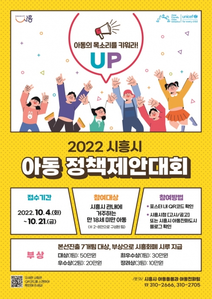 [금요저널] 시흥시는 ‘2022 ‘세계 아동의 날’ 기념 아동정책제안대회’를 앞두고 오는 10월 4일부터 21일까지 대회 참가팀을 모집한다.
