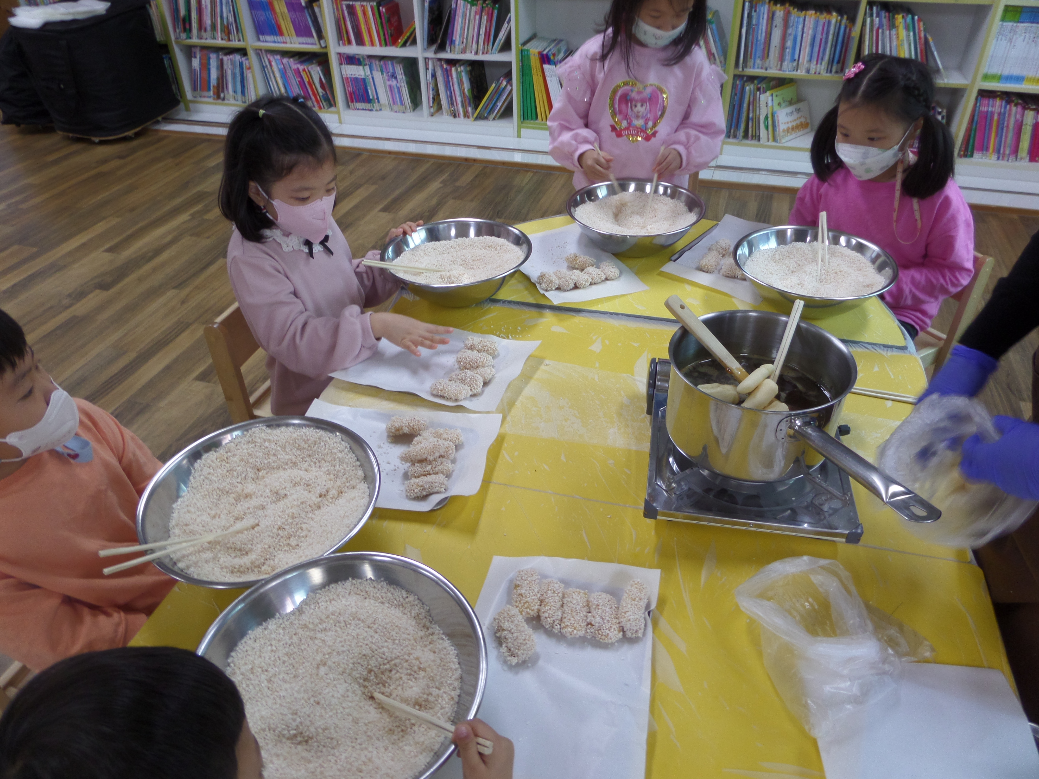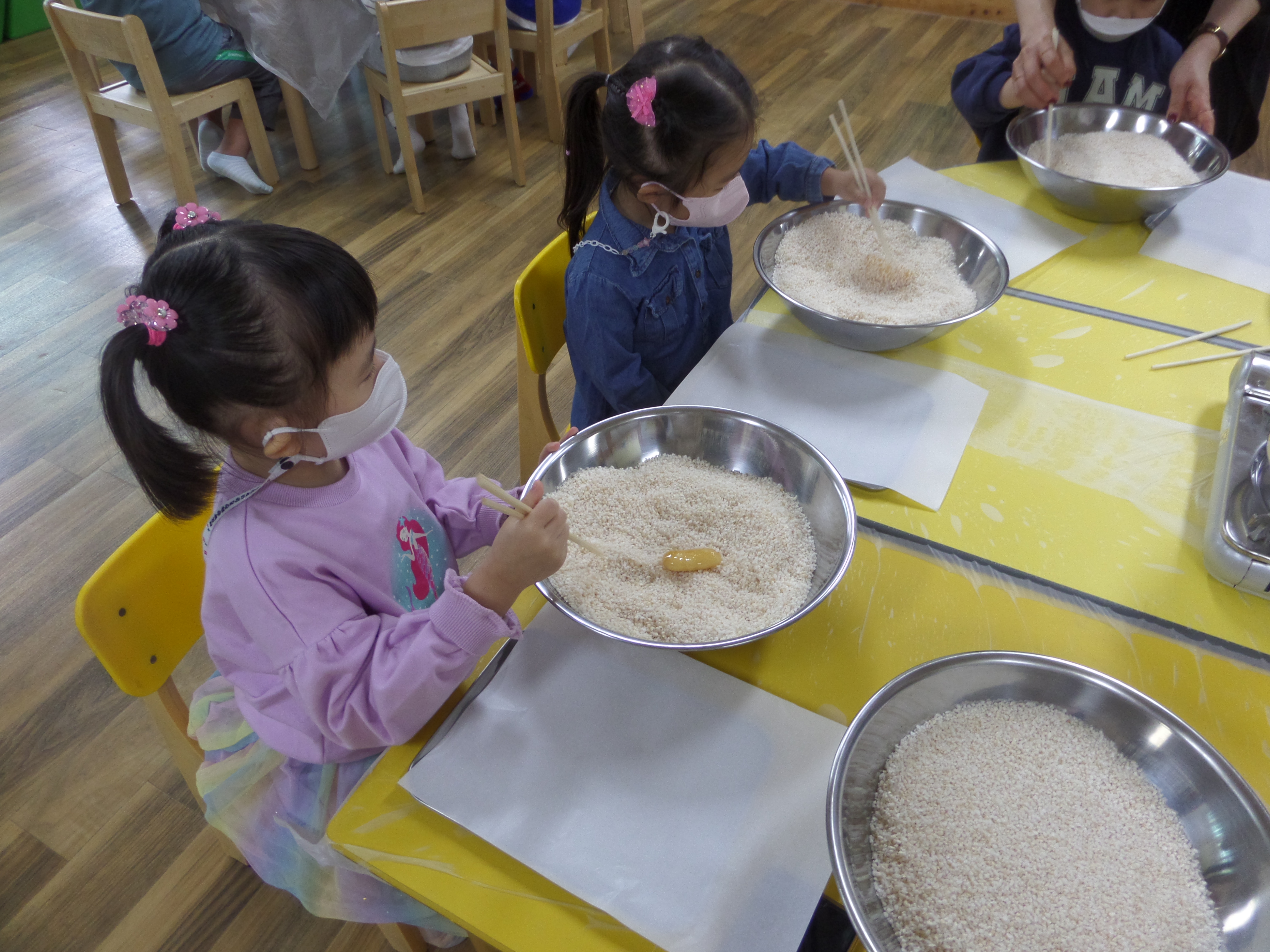 □ 동글동글 튀긴 과자에 조청을 입히고 튀밥 가루 속에 숨은 과자를 찾기 위해 ‘꼭꼭 숨어라, 옛날 과자 찾아라’ 노래를 부르기도 하며 한과 만들기에 재미를 더했다. ‘한과를 직접 만들어서 먹으니 즐거웠다’라며 직접 만든 한과를 부모님께 드리고 싶다고 소감을 전하는 유아도 있었다. 이번 체험으로 유아들이 우리 쌀로 만든 음식에 관심을 가지며 쌀로 만든 튀밥 가루가 “눈송이 같이 예뻐요”라는 신기함을 표현하며 한과 만들기 체험활동에 적극 참여하였다.