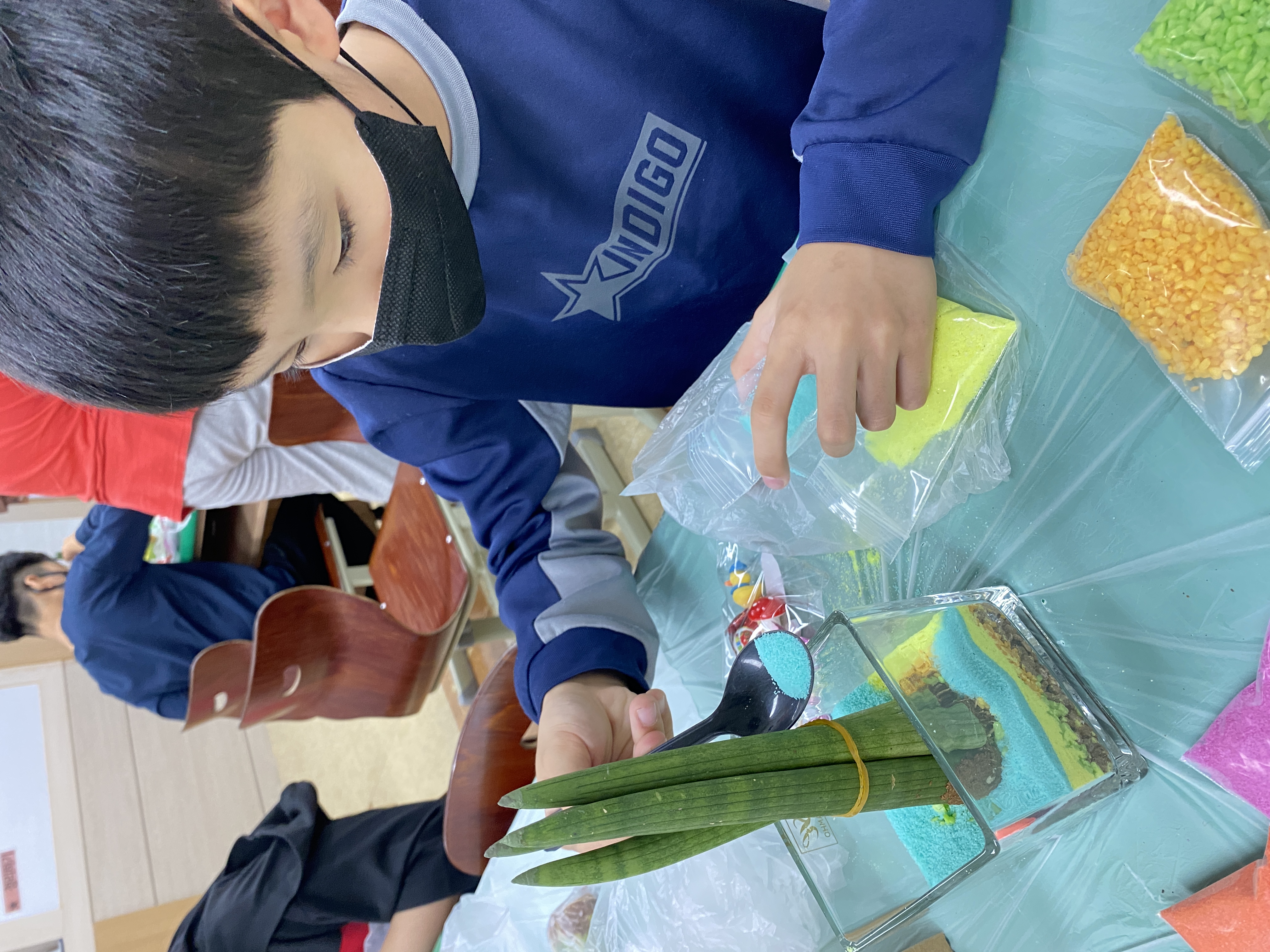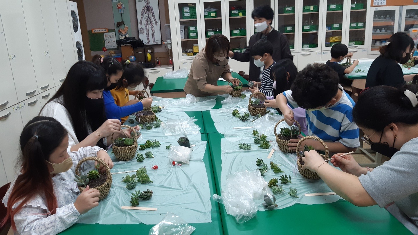 □ 유치원에서부터 2학년까지, 3학년에서부터 6학년까지 2개 반으로 나누어 원예 체험학습을 진행하였다. 유치원~2학년 학생과 학부모님들은 다육바구니 꾸미기를, 3학년~6학년 학생과 학부모님들은 색모래테라리움을 체험하였다. 학부모회의 지원으로 많은 학부모님들이 참여하였고 학교에서 부모님과 함께 체험활동을 하게 된 학생들의 얼굴에 웃음꽃이 피었다.
